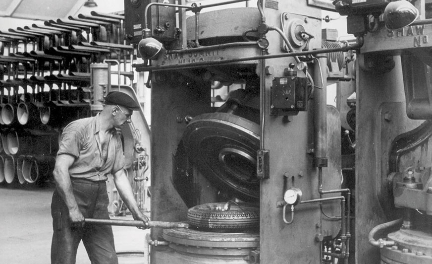 Prasa wulkanizacyjna kończąca proces produkcji opony (1939 r.)