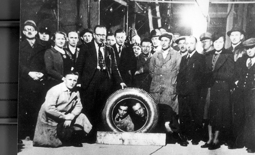 Rok 1939. Pracownicy Fabryki Gum Jezdnych „Stomil” w Dębicy z pierwszą wyprodukowaną oponą