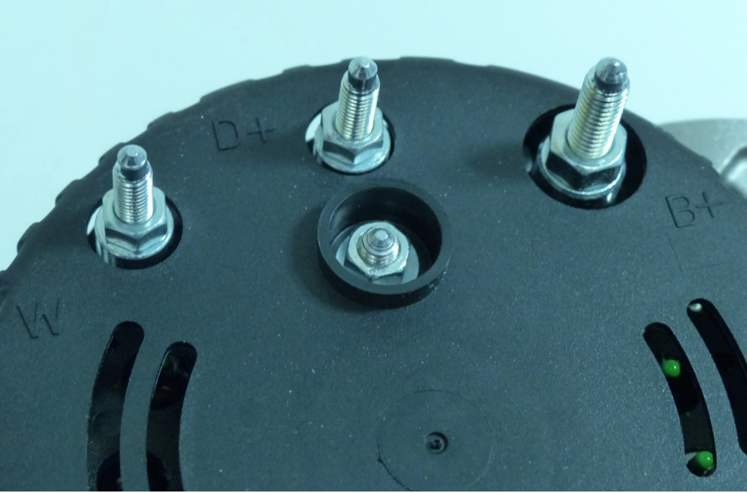 Oznaczenie zacisków generatora: W = sygnał prędkości obrotowej, D+ = kontrolka ładowania i B+ = plus akumulatora