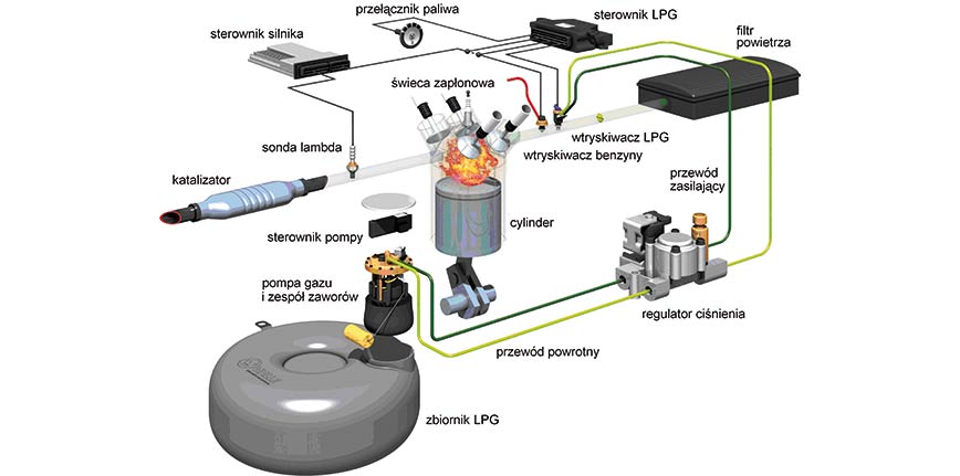Rys. 4. Podstawowe elementy instalacji systemu LPi wtrysku pośredniego gazu płynnego do kolektora dolotowego (źródło: Vialle).