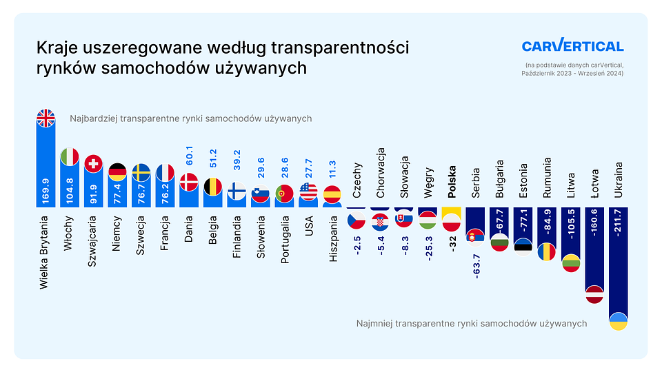 Podobnie jak w poprzednich latach, najbardziej przejrzystym rynkiem samochodów używanych wśród wszystkich krajów uczestniczących w badaniu była Wielka Brytania. Tylko 2,1% samochodów miało tam sfałszowany przebieg, a 17,8% jakieś uszkodzenia odnotowane na koncie. W pierwszej piątce najbardziej przejrzystych krajów znalazły się również Włochy, Szwajcaria, Niemcy i Szwecja.