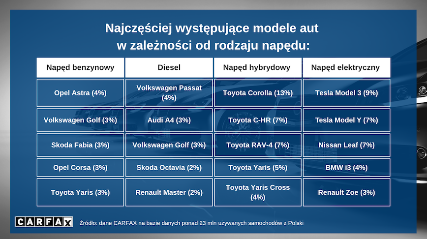 Polski rynek aut używanych jest całkowicie zdominowany przez pojazdy benzynowe (50 proc.) i diesle (44 proc.). Hybrydy i elektryki stanowią razem ok. 4 proc. O ile średni wiek samochodów z silnikami benzynowymi i diesla jest taki sam (16 lat), to ogromną różnicę widać w średnich przebiegach – w przypadku diesli jest on o ok. ⅓ wyższy. Najpopularniejszą marką wśród pojazdów benzynowych jest Opel, a wśród diesli – Volkswagen. W sektorze hybryd zdecydowanie dominuje Toyota, a najczęściej spotykanym elektrykiem jest Tesla.