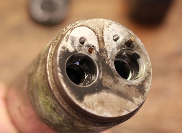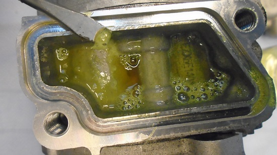 Nadmierne zanieczyszczenie i ciemny olej widoczne na złączach osuszacza. Układ traci wydajność z powodu tak poważnego zanieczyszczenia i musi zostać przepłukany a osuszacz wymieniony.
