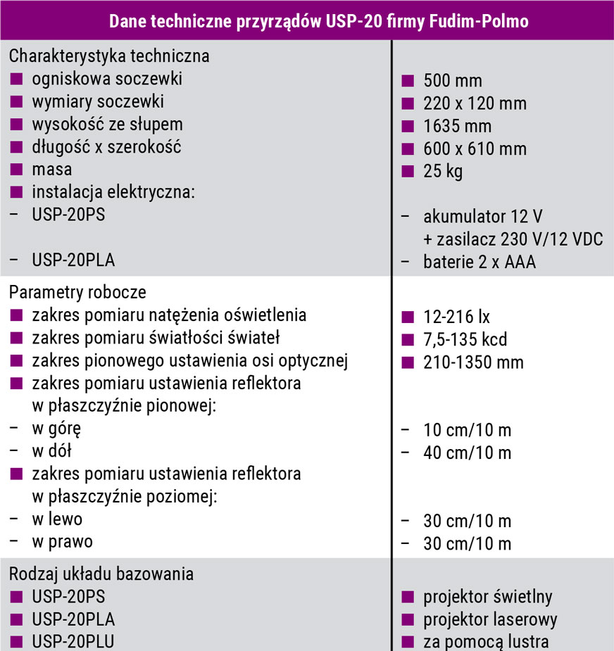 Wielu europejskich producentów sprzętu diagnostycznego oferuje w Polsce swoje przyrządy do kontroli reflektorów. Znanym wytwórcą takich urządzeń jest firma Fudim-Polmo, która do kontroli świateł oferuje fotoelektryczne przyrządy optyczne umożliwiające pomiar wszystkich parametrów diagnostycznych reflektorów (geometrycznych i fotometrycznych). W krajowych stacjach kontroli (obsługi) pojazdów do sprawdzania świateł często używa się przyrządów typu USP-20 tej firmy, które stanowią jedną rodzinę konstrukcyjną, różniącą się sposobem bazowania względem nadwozia samochodu (bazowanie projektorem świetlnym, projektorem laserowym lub za pomocą wizjera/lustra) – rysunek 1.