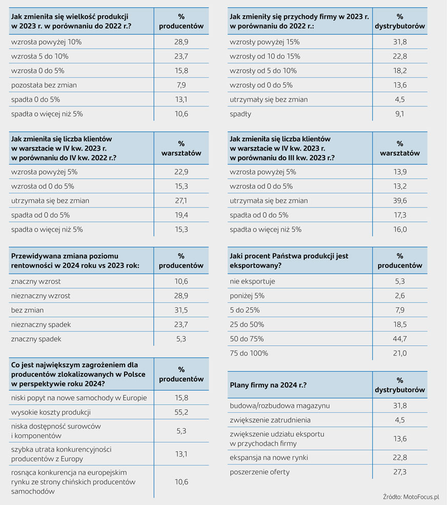 Wiele problemów, z którymi branża zmagała się od początku 2020 r., nie występuje już w tej skali co uprzednio, co oczywiście pomaga w prowadzeniu działalności. Czy 2024 r. będzie podobny? Ostatnie doniesienia medialne o zwolnieniach w przemyśle motoryzacyjnym liczonych w tysiącach nie do końca oddają sytuację w całej branży, co potwierdza omawiany raport.