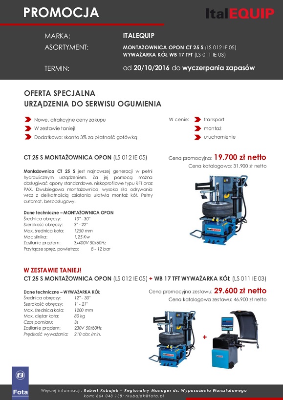 Urządzenia do serwisów ogumienia nawet 40% taniej - to najnowsza oferta sieci Fota. Do tego transport, montaż i uruchomienie gratis. Oferta dotyczy montażownic i wyważarek. Będzie obowiązywać do wyczerpania zapasów.