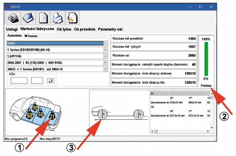 Oprogramowanie automatycznie porównuje wyniki pomiarów z danymi wzorcowymi dla 29 000 modeli samochodów z całego świata od 80 producentów. Program GTO PC zawiera również graficzne wskazówki na temat przygotowania pojazdu do pomiaru oraz określa sposoby regulacji parametrów geometrii kół zgodnie z zaleceniami producentów samochodów.
