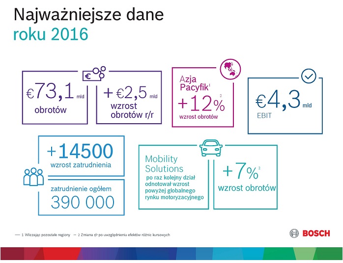 Obroty Grupy Bosch wzrosły w 2016 roku do 73,1 mld EUR. Odpowiada to wzrostowi w wysokości 3,6%, z pominięciem efektu różnic kursów wymiany walut 5,5%. Obciążenia związane z negatywnymi efektami różnic kursowych wyniosły w ubiegłym roku ogółem 1,3 mld EUR. Operacyjny dochód przed odliczeniem podatków i odsetek (operacyjny EBIT) wyniósł 4,3 mld EUR, a operacyjny zysk EBIT osiągnął 5,8%. W dochodzie za rok 2016 widoczny jest wpływ inwestycji związanych z zabezpieczeniem przyszłości koncernu. W 2016 roku Bosch zwiększył nakłady na działalność badawczo-rozwojową o prawie 10%, do 7 mld EUR. – Bosch musi poczynić znaczne inwestycje związane z transformacją, a równocześnie zadbać o wysoką dochodowość w dłuższej perspektywie – powiedział prof. dr Stefan Asenkerschbaumer, dyrektor ds. finansowych i zastępca prezesa zarządu. W 2016 roku EBIT, na który negatywnie wpłynęły efekty specjalne, wyniósł 3,3 mld EUR.