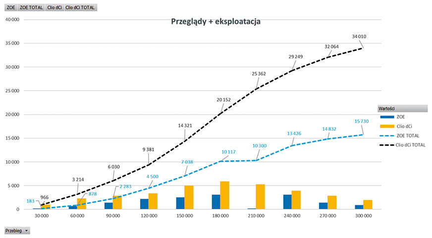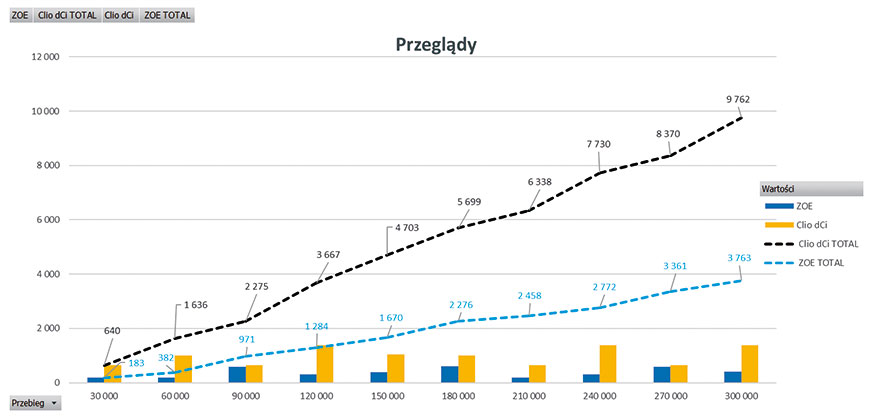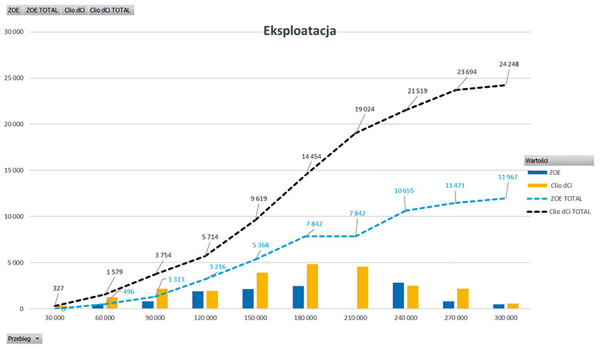 Porównanie kosztów eksploatacji i wymiany części dla dwóch samochodów (oba z przebiegiem 300 tys. km) z tego samego segmentu