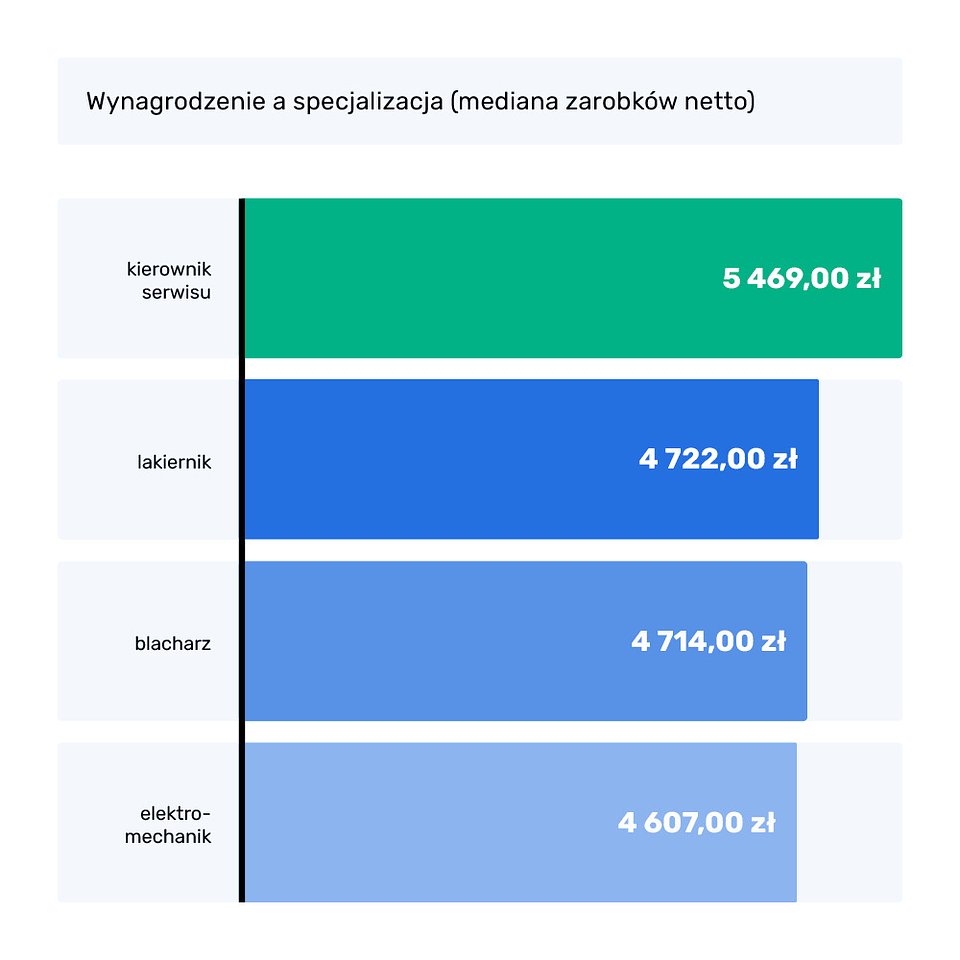 Najwięcej elektromechaników (31,7%) otrzymuje pensję w przedziale od 3000 do 4000 zł netto. W przypadku lakiernika najczęściej można liczyć na wynagrodzenie od 4000 do 6000 zł netto, natomiast prawie połowa blacharzy (46,7%) otrzymuje miesięcznie między 4000 a 5000 zł na rękę. Kierownik serwisu to najlepiej opłacana specjalizacja. 60% specjalistów na tym stanowisku zarabia powyżej 5000 zł netto.