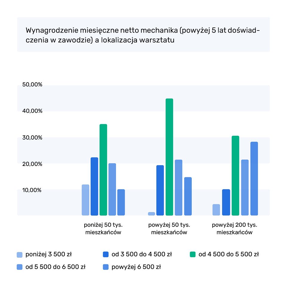 W badaniu sprawdzono również wpływ lokalizacji warsztatu na wysokość pensji. W małych, średnich, jak i dużych miastach najwięcej doświadczonych mechaników zarabia 4500 - 5500 zł netto. W miastach powyżej 200 tys. mieszkańców odsetek mechaników najlepiej zarabiających (powyżej 5500 zł netto) jest największy.