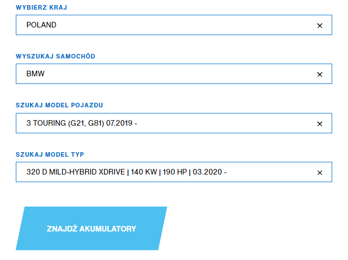 Korzystając z wyszukiwarki akumulatorów Exide, mechanicy mogą dobrać odpowiedni akumulator wprowadzając numer VIN pojazdu, numer części lub w oparciu o oryginalnie zamontowany akumulator, posługując się jego numerem części. Można również znaleźć akumulator metodą krok-po-kroku wprowadzając markę i model pojazdu i wskazując dokładną wersję silnikową. Każdy ze sposobów prowadzi do jednego - znalezienia akumulatorów 12V odpowiednich do obsługiwanego pojazdu.