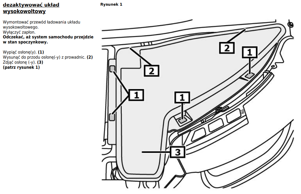 ** Prace z układami wysokiego napięcia są możliwe jedynie w uprawnionych do tego warsztatach, wykonywane przez pracowników z odpowiednimi kwalifikacjami.