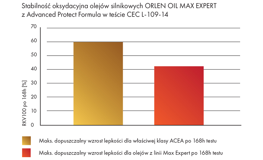 Oleje silnikowe Orlen Oil Max Expert opracowane w technologii Advanced Protect Formula zwiększają ochronę oksydacyjną oleju o co najmniej 30%, co potwierdzają wyniki testu oceny stabilności oksydacyjnej według normy CEC L-109-14. Nadmierne utlenianie oleju prowadzi do wzrostu jego lepkości, co negatywnie wpływa na osiągi samochodu.