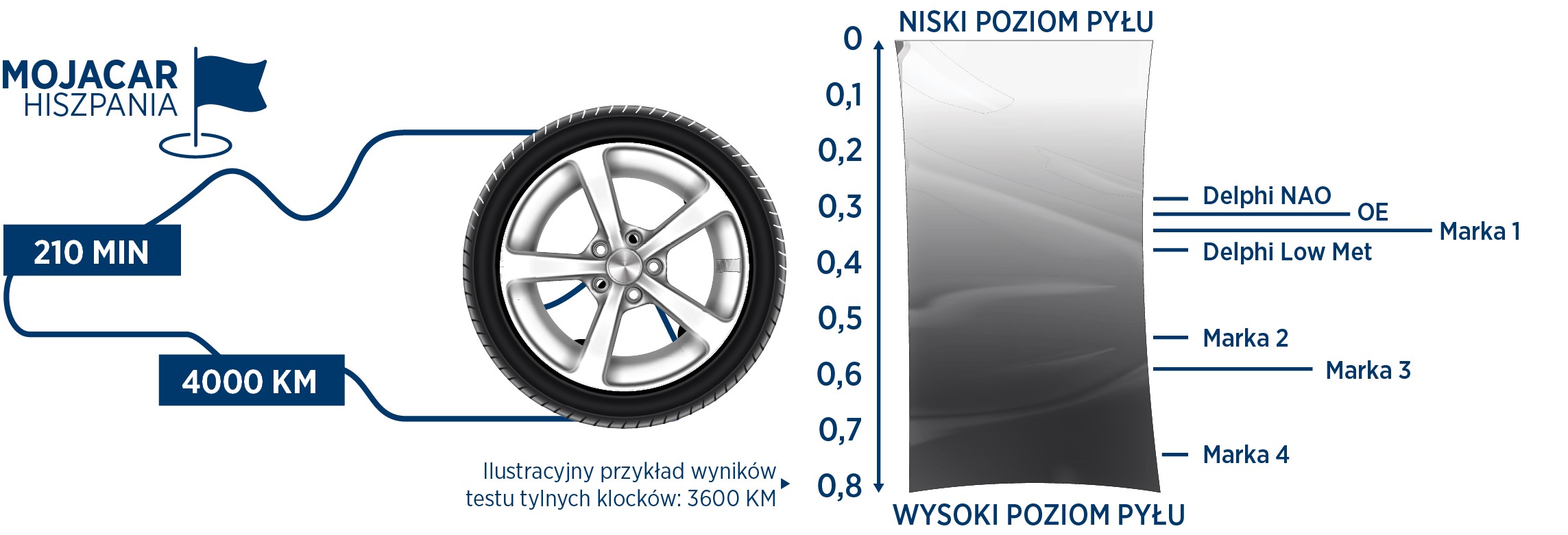 Pierwsze miejsce zajął klocek NAO oferowany przez Delphi, który wyprzedził inne marki premium i OE w testach emisji pyłów. Mniej pyłu hamulcowego oznacza wolniejsze zużycie hamulców oraz, co ważne, mniejszą ilość cząstek uwalnianych do środowiska.