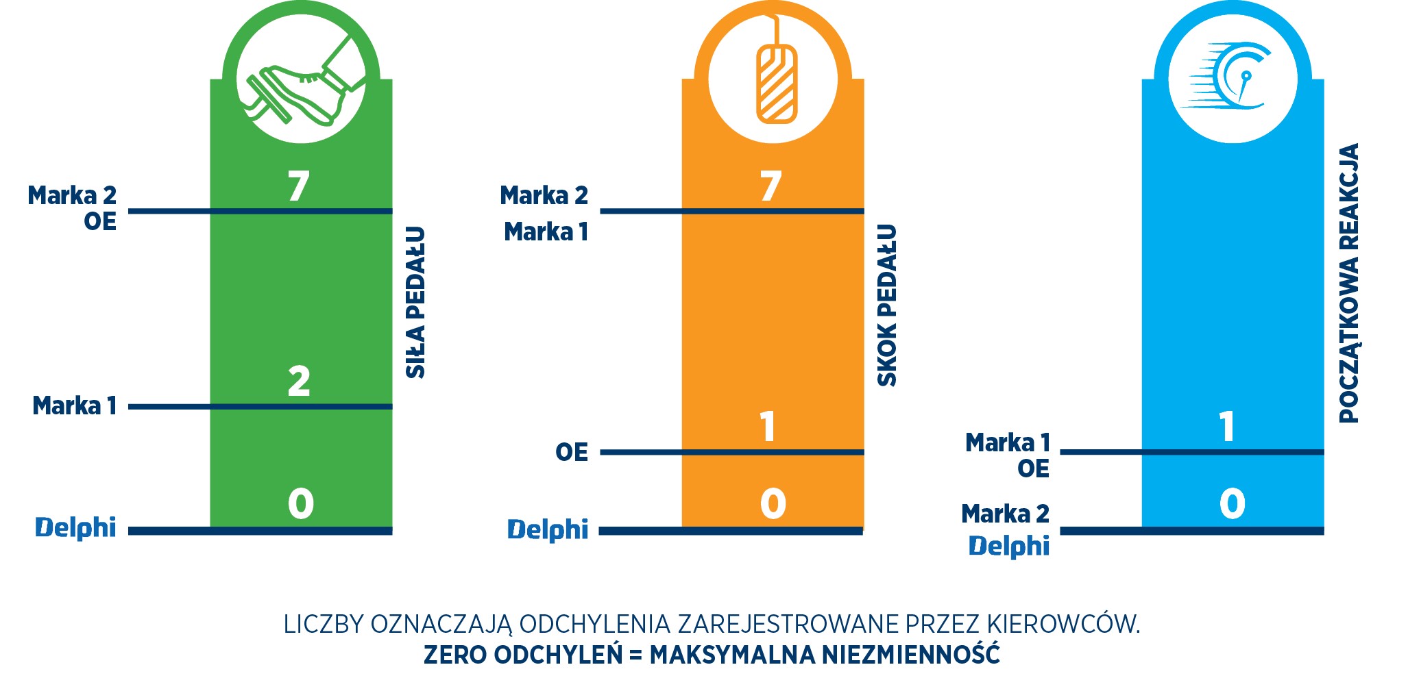 Klocki hamulcowe Delphi zostały przetestowane przez niezależnych profesjonalnych kierowców, którzy potrafią wykryć nawet najdrobniejsze różnice w wyczuciu pedału hamulca. W porównaniu z konkurencją klocki Delphi uzyskały najbardziej spójne wyniki. Zero odchyleń to znamienny rezultat – oznacza, że przy każdym użyciu pedału hamulca kierowca czuł go tak samo. Nie było żadnych niespodzianek, żadnych zmian w oporze i żadnych opóźnień reakcji. Ta niezmienność to podstawa bezpieczeństwa kierowcy, ponieważ pozwala mu wykształcić pamięć mięśniową i intuicyjne zrozumienie zachowania pojazdu podczas hamowania.