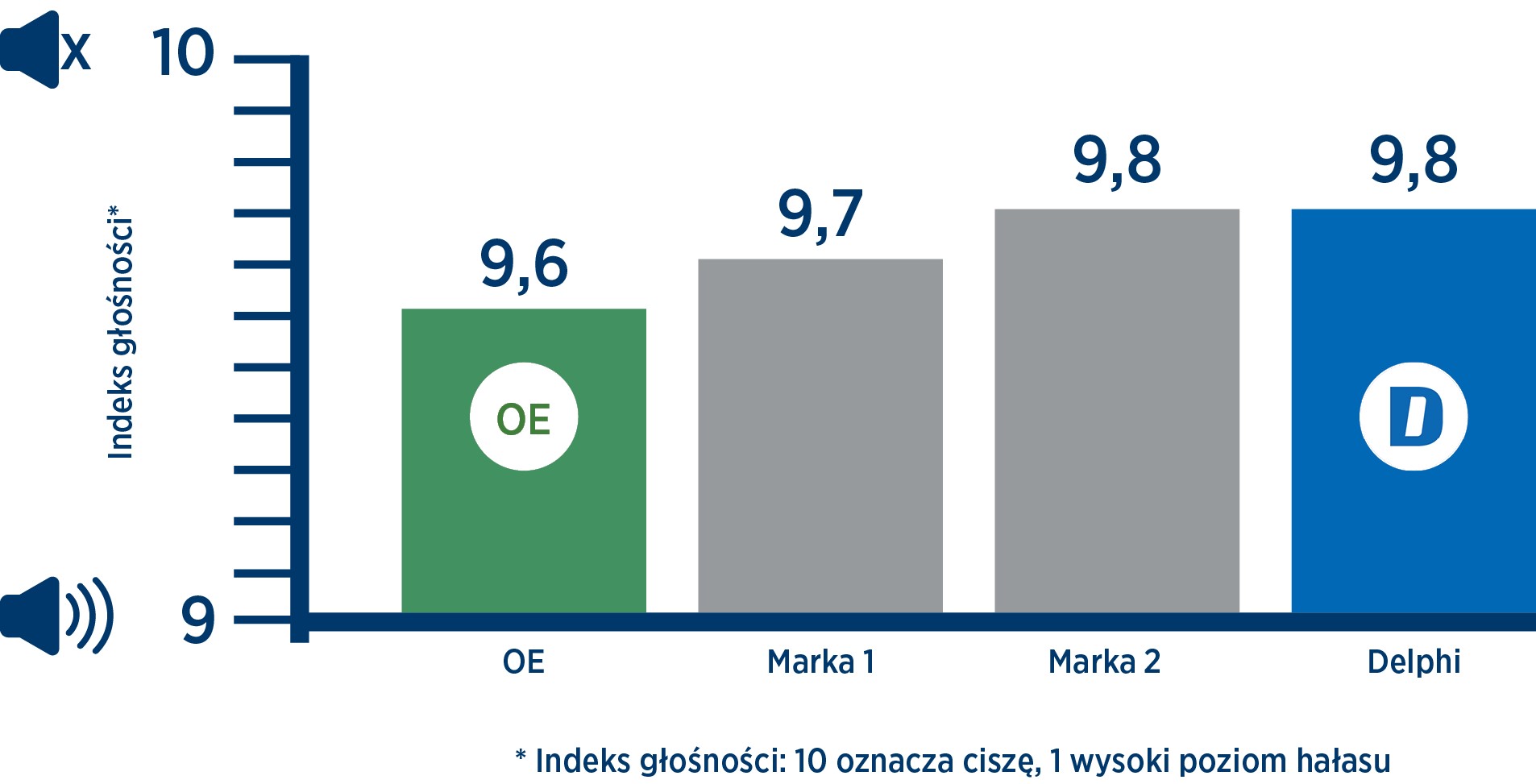 W teście dotyczącym hałasu klocki Delphi zdobyły najwyższe oceny za ciche działanie i uzyskały indeks głośności 9,8, przy czym 10 oznacza całkowitą ciszę. Przewyższyły tym samym osiągi konkurentów zarówno z rynku IAM, jak i OE.