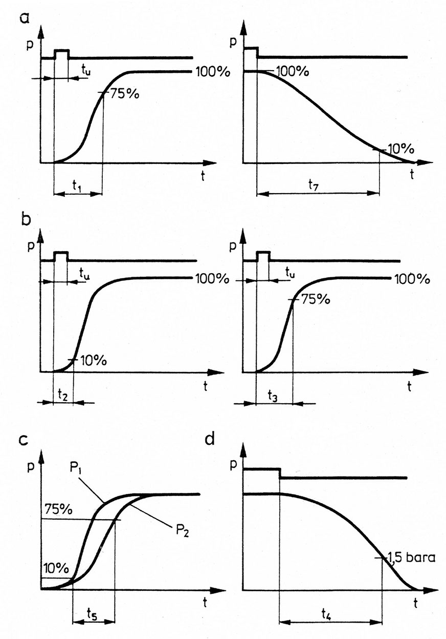 - w przewodzie sterującym czas od rozpoczęcia nacisku na pedał hamulca roboczego do chwili uzyskania ciśnienia równego 10% wartości asymptotycznej powinien wynosić nie więcej niż 0,2 s, a do chwili uzyskania ciśnienia równego 75% wartości asymptotycznej – nie więcej niż 0,4 s.