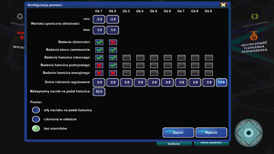 rys 2a. Przykład ekranu umożliwiającego konfigurację badania pojazdu (rodzaj hamulców, wartości ciśnień, liczba osi pojazdu) na urządzeniu rolkowym (źródło: Unimetal): program Uniline Quantum 1