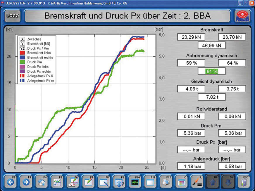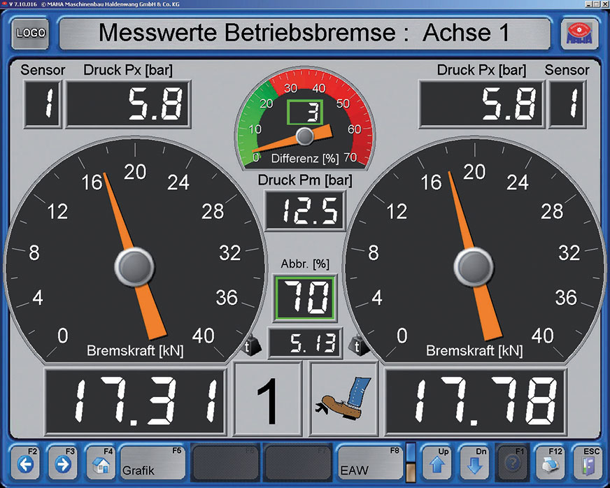 Nowoczesne urządzenia do pomiaru sił hamowania, wyposażone w wagę i zbudowane z zastosowaniem techniki mikroprocesorowej mają oprogramowanie, które pozwala diagnoście na wybranie rodzaju badanych hamulców (roboczy, awaryjny, postojowy, sterowany hydraulicznie lub pneumatycznie) i liczby osi pojazdu (rys. 2). Zastosowane oprogramowanie jednostki sterującej umożliwia samoczynne obliczenie wymaganych parametrów diagnostycznych układu hamulcowego, przedstawienie ich na tablicy z wyświetlaczami (rys. 3) lub na ekranie monitora w postaci wykreślnej (rys. 4) i liczbowej (rys. 5), a także w formie wydruku (rys. 6). Zwalnia to diagnostę z konieczności wykonywania czasochłonnych obliczeń, a jego rola sprowadza się do interpretacji otrzymanych wyników pomiarów i obliczeń.