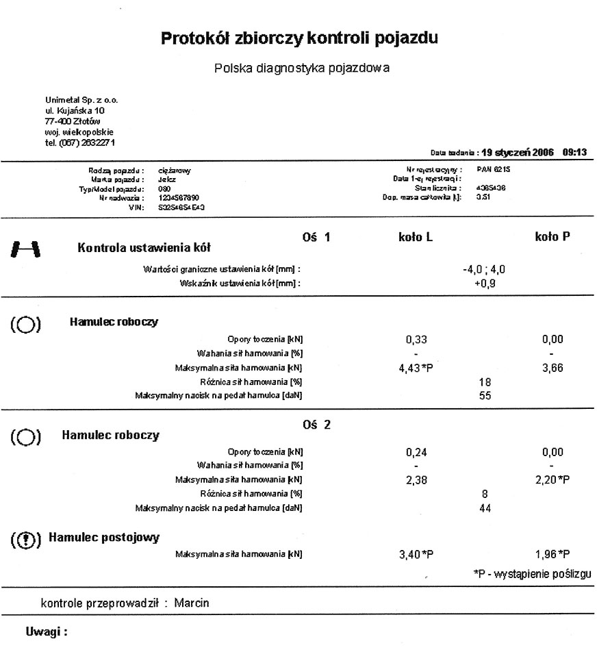 rys 6. Protokół z badania układu hamulcowego pojazdu ciężarowego na urządzeniu rolkowym (przykład) – źródłoa: Unimetal