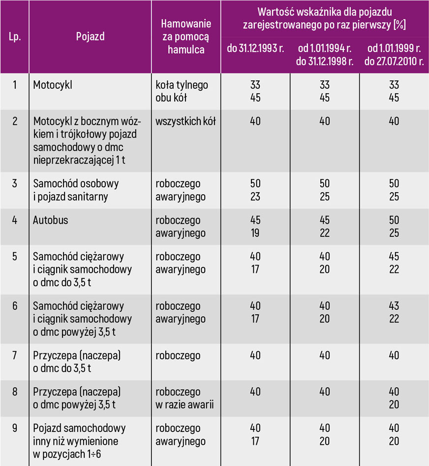 Tabela 1. Wartości wskaźników skuteczności hamowania – wymagane minimalne