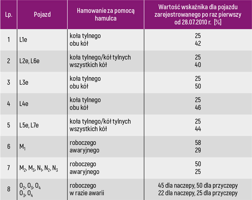 Tabela 2. Wartości wskaźników skuteczności hamowania – wymagane minimalne