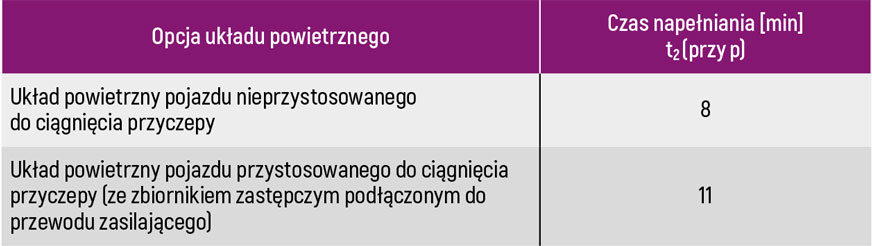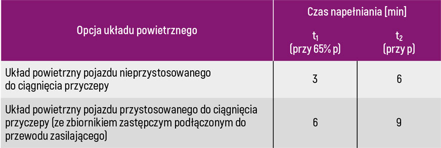 Tabela 3. Dopuszczalne maksymalne czasy napełniania zbiorników powietrza w układzie przenoszącym hamulców
