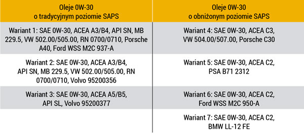 Oleje klasy SAE 0W-30 występują na rynku również w dwóch zasadniczych wariantach jakościowych – jako oleje do samochodów bez filtrów cząstek stałych oraz jako oleje do samochodów z filtrami cząstek stałych, przy czym, w odróżnieniu od olejów w klasie lepkości 0W-40, oleje do samochodów bez filtrów cząstek stałych to produkty o charakterze wysoce specjalistycznym, przeznaczone do konkretnych marek samochodów (tabela 2) – VW (głównie do samochodów produkowanych w latach 2005-2016), PSA (silniki Euro 6), Ford (wybrane silniki Diesla zbudowane po roku 2015), BMW (wybrane silniki benzynowe i diesel zbudowane po roku 2013).