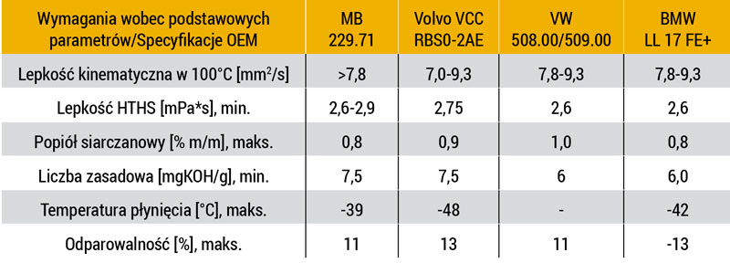 Tabela 4. Wymagania wobec podstawowych parametrów fizykochemicznych specyfikacji jakościowych OEM opracowanych dla olejów klasy SAE 0W-20