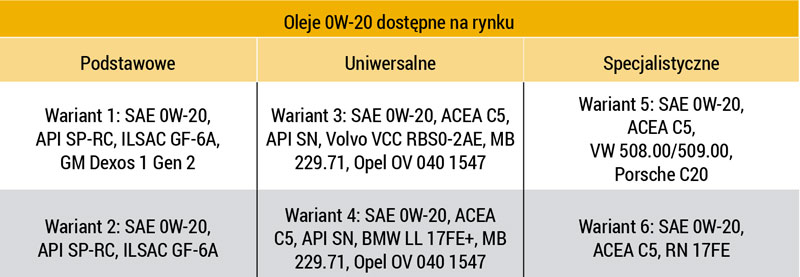 Wymienione w tabeli 4 wymagania, choć zbliżone, nie zawsze mogą być spełnione w formulacji jednego, tego samego, produktu. Przykładowo, ze względu na wymóg specyfikacji Volvo wobec lepkości HTHS (>2,75) połączenie specyfikacji Volvo VCC RBS0-2AE i BMW LL 17FE+ w jednym produkcie nie jest możliwe, gdyż tak wysoka wartość lepkości HTHS nie pozwala na spełnienie wymagań testu energooszczędności wymaganego przez BMW. W efekcie opisanych rozbieżności oleje w klasie lepkości 0W-20 występujące na rynku można podzielić na trzy grupy przedstawione w tabeli 5.