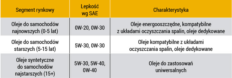 Po omówieniu, w tym i poprzednich artykułach, różnorodności olejów syntetycznych dostępnych na rynku powstaje pytanie: jakie oleje powinny być dostępne w nowoczesnych warsztatach? Po pierwsze, nowoczesne serwisy mogą stosować wyłącznie syntetyczne oleje silnikowe. Po drugie, dobór asortymentu powinien być uzależniony od wieku obsługiwanych samochodów i najczęściej obsługiwanych marek. Warto również zauważyć, że skoro, w opinii użytkowników końcowych, najważniejszą cechą oleju silnikowego determinującą ich decyzję zakupową jest jego lepkość – warsztaty powinny dysponować asortymentem zawierającym co najmniej jeden wariant produktowy w każdej lepkości przedstawionej w tabeli 6.