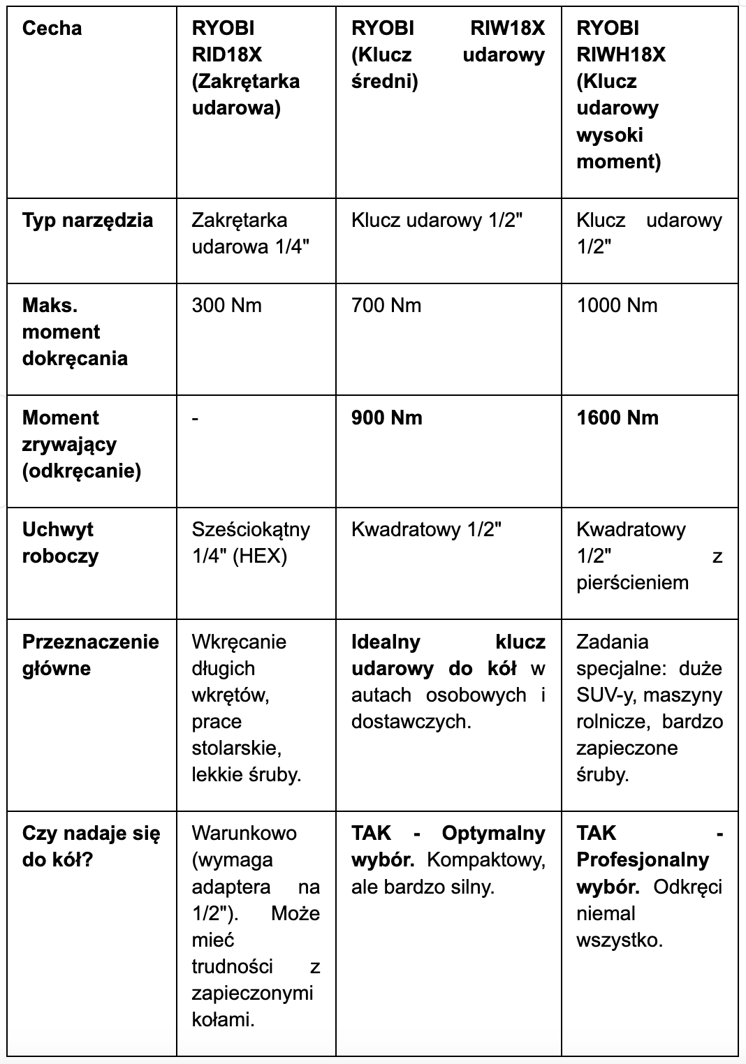 - Jeśli szukasz dedykowanego narzędzia do sezonowej wymiany kół, model klucza udarowego RYOBI RIW18X jest "złotym środkiem" - oferuje aż 900 Nm momentu zrywającego, co wystarczy w 99% aut osobowych.