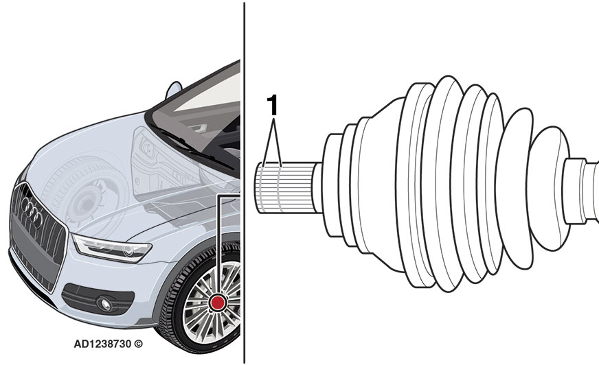 Odpowiedź: Znana jest nam opisana usterka występująca w modelach Audi Q3 wyprodukowanych przed 17.03.2015. Jej przyczyną jest nadmierny luz pomiędzy piastą przedniego koła a wałkiem napędowym. Aby pozbyć się problemu, należy wymontować wałek napędowy z piasty przedniego koła. Gruntownie oczyść wypusty na wale napędowym. Nałóż na wypusty wału napędowego dwie krople środka zabezpieczającego do gwintów, dostępnego w dziale części Audi (fot. 2.1). Zamontuj wałek napędowy do piasty przedniego koła. Zamontuj nową śrubę mocującą wałka napędowego i dokręć prawidłowym momentem dokręcenia. Czynności te powtórz po drugiej stronie samochodu. Pojazd MUSI stać w miejscu przez 8 godzin, aby środek zabezpieczający do gwintów stwardniał. Po upływie tego czasu należy wykonać jazdę próbną, aby sprawdzić, czy problem został rozwiązany.