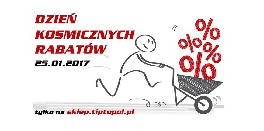 Obniżki aż do - 63% w TIP-TOPOL. Tylko kilka dni pozostało do trzeciej już edycji akcji promocyjnej Dzień Kosmicznych Rabatów. Obniżką ponownie objęte zostaną tylko 4 produkty – jak zawsze niezbędne w każdym warsztacie! Co ważne, oferta dostępna będzie tylko 25 stycznia br., wyłącznie na sklep.tiptopol.pl.