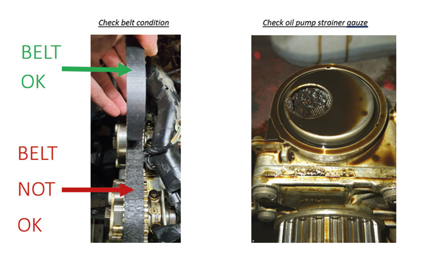 Jeśli zastosowano olej o niewłaściwej specyfikacji lub przeoczono termin wymiany określony przez producenta OEM, nadmiernie zdegradowany olej może mieć wpływ na działanie układu pasek w oleju. Na przykład spowodować spęcznienie paska lub pogorszenie jego stanu
