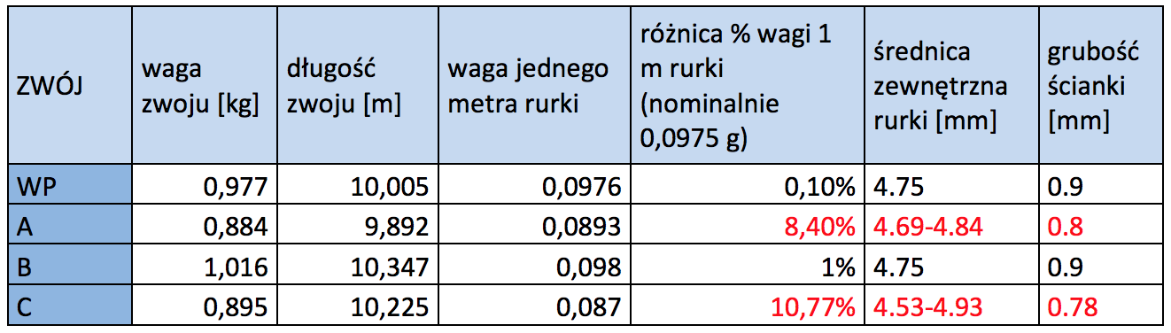 W tym etapie zmierzyliśmy takie parametry jak długość zwojów, waga, średnica zewnętrzna rurki i grubość ścianki. Podczas mierzenia długości zwojów zaskoczyło nas, że były tu ogromne rozbieżności. Zwój „B” był za długi o 34 cm, a zwój „C” o 22,5 cm. Zwój „A” był za krótki o 10,8 cm. Takiej wielkości różnice wzbudzają pytanie w jaki sposób i czym jest odmierzana długość zwojów u tych producentów. Zwój „WP” miał 10,005 mm, a tak dokładny wynik jest zasługą zautomatyzowanego odmierzania enkoderem inkrementalnym. Na podstawie wymiarów fizycznych i wagi mogliśmy określić jeden z najbardziej istotnych parametrów, czyli ilość miedzi na jeden metr rurki. Gęstość miedzi technicznej to 8.96g/cm^3, co przy wymiarach rurki 4.75mm x 0.9mm daje nam wagę metra rurki na poziomie 0,0975kg. Wyniki przedstawione w tabeli są bezlitosne, bo jednoznaczne pokazują w jaki sposób czyni się oszczędności w tej grupie produktowej. Rurki „A” i „C” zmniejszając tylko grubość ścianki oferują od 8 do prawie 11% mniej materiału w produkcie. Zauważamy również, że tam gdzie grubość ścianki była mniejsza niż 0.9mm, produkty miały problem z zachowaniem okrągłego kształtu przekroju rurki na całej jej długości, co może powodować osłabienie wytrzymałości produktu w miejscach zwężenia.