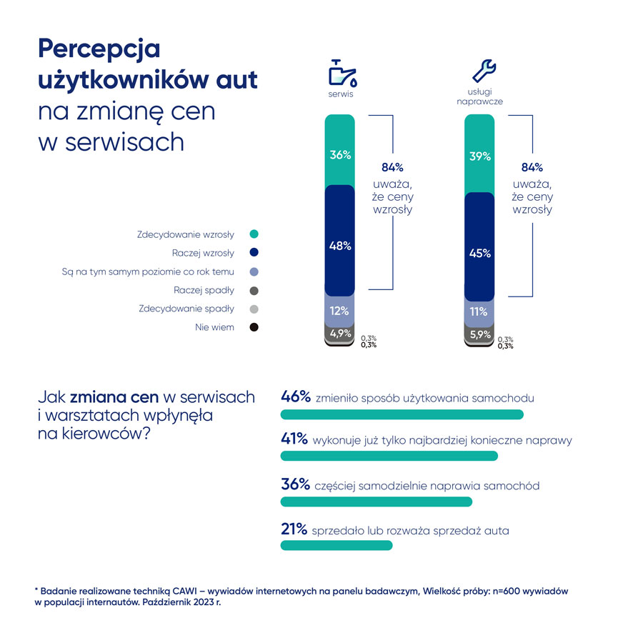 Aż 8 na 10 użytkowników aut zauważyło wzrost cen serwisu lub naprawy samochodu. Z drugiej strony 9 na 10 kierowców jest zadowolonych z poziomu usług warsztatów i serwisów, a 7 na 10 ocenia koszt wykonywanej usługi jako przynajmniej akceptowalny. Wskazuje to na wyrozumiałość względem podwyżek i rozumienie ich przyczyn. Według kierowców biorących udział w badaniu wynikają one przede wszystkim ze wzrostu kosztów energii elektrycznej i innych mediów, cen części oraz kosztów prowadzenia działalności. Zrozumienie nie oznacza jednak gotowości do płacenia coraz wyższych rachunków, ponieważ wielu kierowców decyduje się na poszukiwanie alternatyw, pozwalających na obniżenie kosztów.