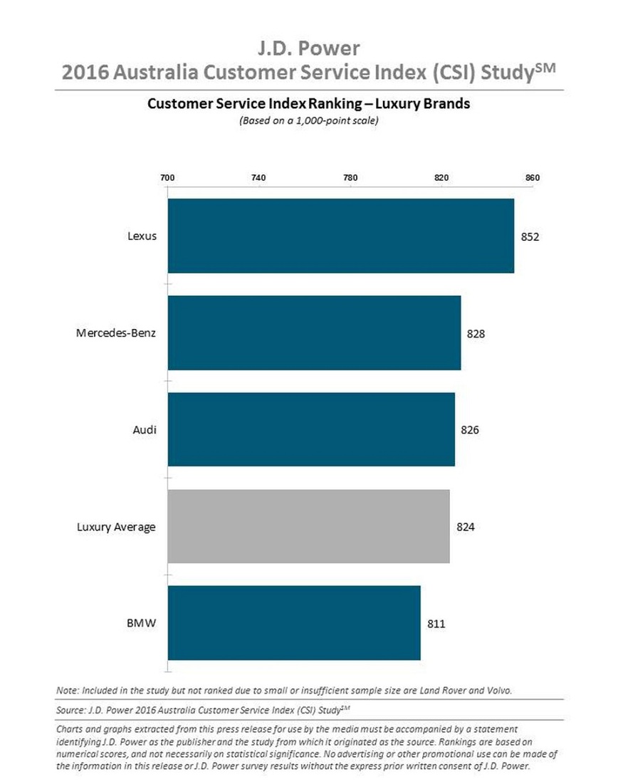 Według opublikowanego przez firmę analityczną JD Power raportu 2016 Australia Customer Service Index (CSI), najbardziej zadowolonymi z jakości serwisu posiadaczami samochodów klasy premium są klienci salonów Lexusa. Ankietowani klienci oceniali firmowe salony według pięciu kryteriów. Były to jakość serwisu, przyjęcie pojazdu, doradca serwisowy, rozpoczęcie obsługi i jakość lokalu.