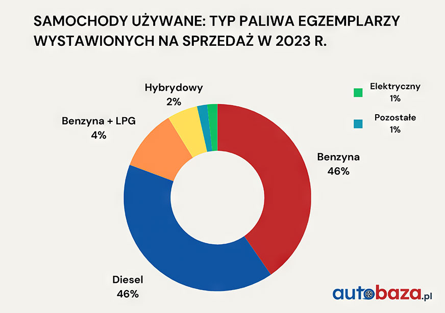 Warto pamiętać, że mimo powoli zmieniającego się krajobrazu na rynku motoryzacyjnym, w 2023 r. niezmiennie „rządziły” napędy benzynowe i diesel – z odpowiednio 46,04-procentowym oraz 46,2-procentowym udziałem w ofertach aut używanych.