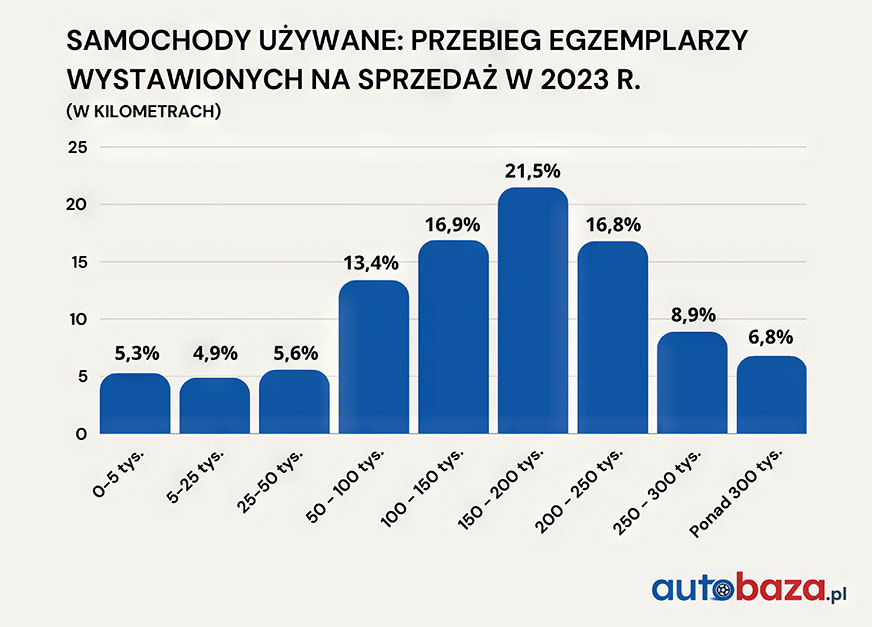 Z danych serwisu autobaza.pl wynika, że w 2023 r. najczęściej spotykanym przebiegiem wśród aut używanych wystawionych na sprzedaż był przedział 150-200 tys. km (21% ofert). Drugim najpopularniejszym był 100-150 tys. (17% ofert), a trzecim 200-250 tys. km (16,5% ofert).