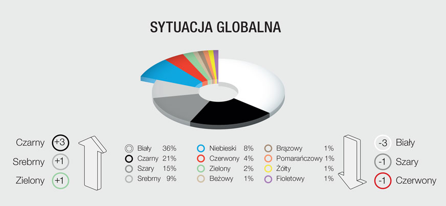 W rankingu kolorów achromatycznych, które zawsze stanowiły fundament palety wykorzystywanej przez branżę motoryzacyjną, zachodzą poważne zmiany. Kolor biały zachował co prawda pozycję lidera w segmencie lekkich samochodów osobowych, ale jego udział w rynku znacząco się zmniejszył. Dla odmiany mocno zyskał kolor czarny, który przejął część rynku od bieli.