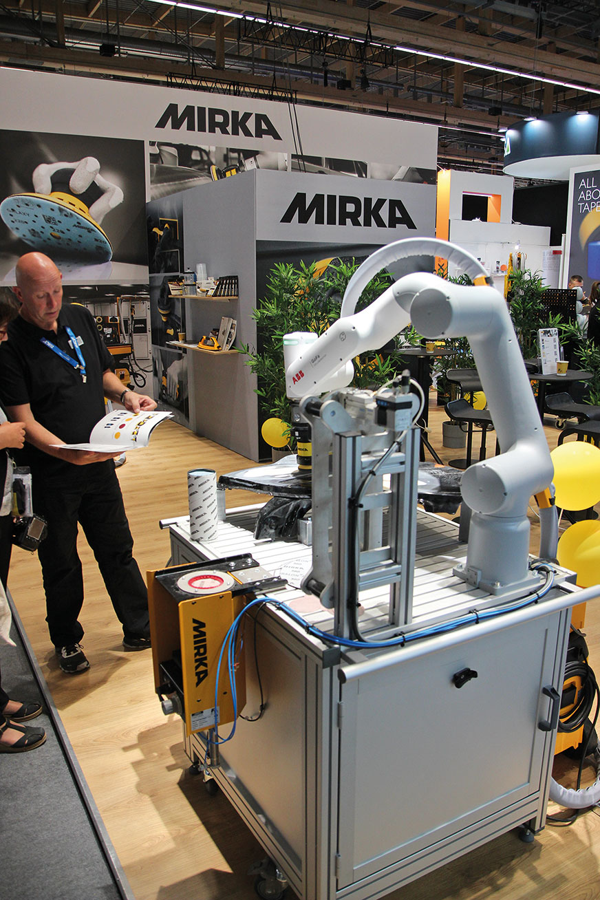 W sąsiedztwie stoiska (hala 11.1, stoisko A57) mieliśmy dowód, że także zrobotyzowane głowice szlifierskie są kompaktowe, lekkie i zaprojektowane z myślą o ciągłej pracy na robotach o niskim udźwigu. Firma Mirka ma sporo doświadczenia we wdrażaniu robotów w różnych gałęziach przemysłu wytwórczego – tak w szlifowaniu, jak i polerowaniu. Jednak i na polu czyszczenie spoin uproszczono zabieg dzięki nowej szlifierce Mirka® FBS-B, która zapewnia bezprzewodową wygodę szlifowania taśmowego. To kompaktowe narzędzie akumulatorowe zaprojektowano do szlifowania paneli i napraw karoserii, czyszczenia spoin spawalniczych i zgrzewów punktowych podczas napraw powypadkowych, a także renowacji pojazdów. Z zamontowanym akumulatorem 5,0 Ah szlifierki te ważą mniej niż 1,2 kg. Dzięki mechanizmowi napinającemu i otwartemu dostępowi do pasa ten można łatwo wymienić w ciągu zaledwie kilku sekund! Urządzenie wyposażone jest w lampkę, która oświetla powierzchnię roboczą i poprawia precyzję szlifowania, a rączka ma ochronną klapkę, która chroni dłoń operatora przed iskrami. Oprócz wygodnego i bezpiecznego bezstopniowego przycisku spustowego, prędkość szlifowania można łatwo regulować w zakresie od 2200 obr./min do 17 000 obr./min w siedmiu krokach za pomocą przycisków zamontowanych na rączce, znanych z innych bezprzewodowych narzędzi. A dzięki łączności Bluetooth® szlifierka taśmowa jest sparowana z aplikacją mobilną myMirka®, która pomaga operatorom monitorować poziom wibracji i rejestrować narzędzia.