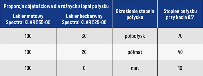 3. Dobór stopnia matowości – na podstawie wzornika lakierów matowych lub własnoręcznych natrysków wg zaleceń z karty technicznej lakieru matowego Spectral KLAR 535-00.