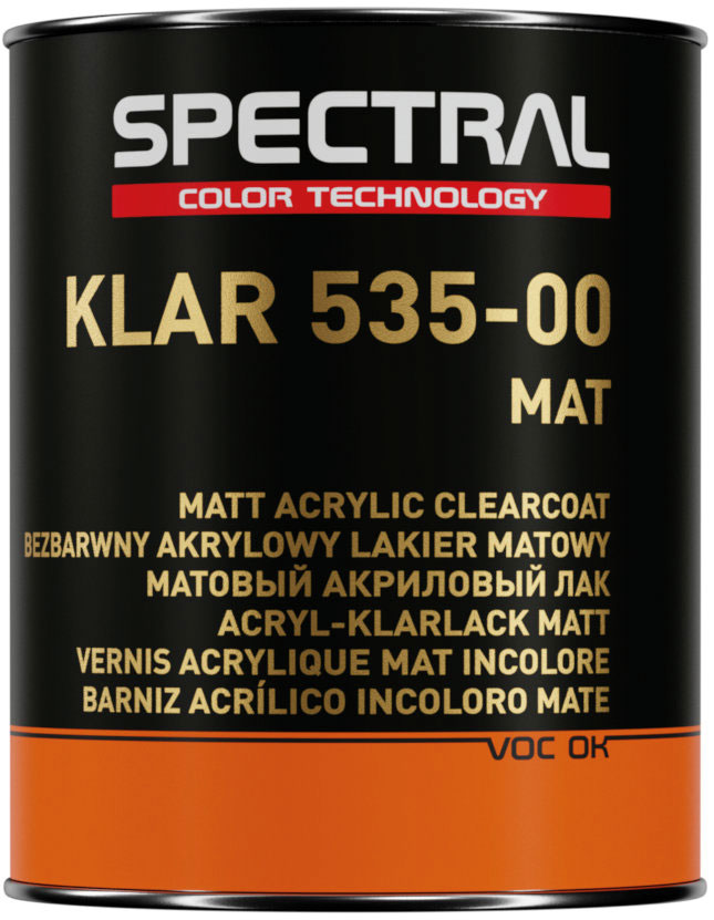 Świetne recenzje zbiera nowy bezbarwny lakier matowy polskiego producenta – firmy NOVOL, a mianowicie Spectral KLAR 535-00. Jest to produkt klasy HS, oparty na szybkoschnących żywicach, posiadający w składzie dodatki SR (Scratch Resistance – zapewniające większą odporność na zarysowania). Utwardzona powłoka ma jednolity poziom matowości. Przyjazna dla lakiernika jest możliwość usuwania wtrąceń w trakcie aplikacji lakieru matowego na bazę wodorozcieńczalną Spectral WAVE 2.0. Jeżeli po aplikacji pierwszej lub drugiej warstwy lakieru matowego pojawią się wtrącenia, należy poczekać ok. 20 min w 20°C i usunąć je za pomocą papieru ściernego na gąbce o gradacji P800-P1000, a następnie aplikować kolejne warstwy lakieru matowego.