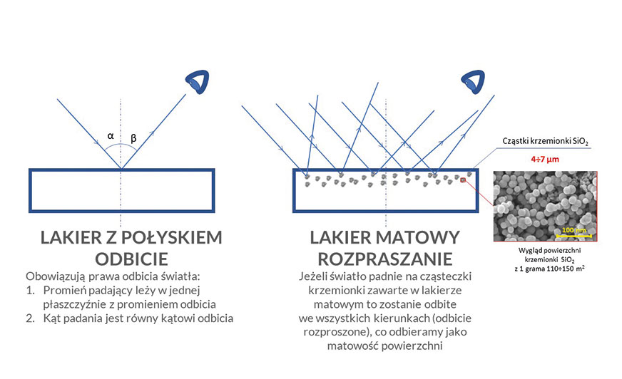 Zjawisko matowienia polega na rozproszeniu (kąt padania światła jest inny niż kąt odbicia) padającego światła na cząsteczkach krzemionki zawartych w matowej powłoce lakierowej. W przypadku lakieru bez środków matujących następuje odbicie i uzyskanie pełnego połysku.
