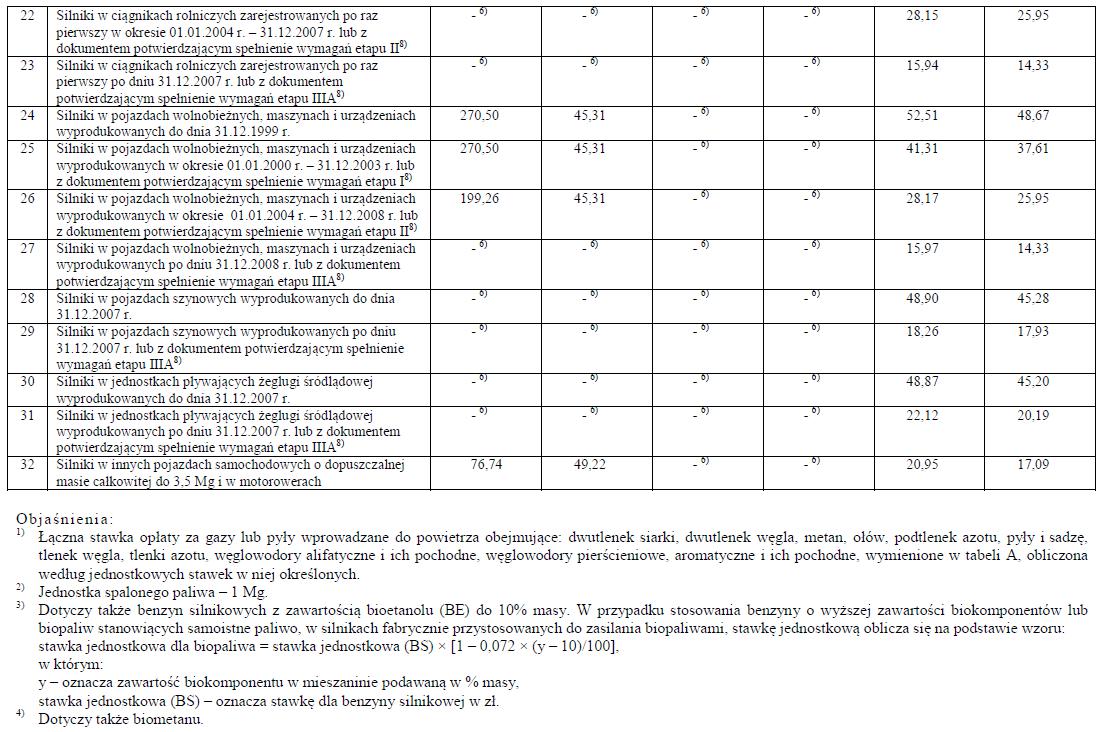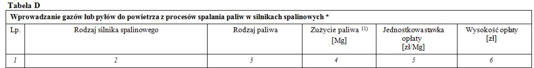 W tabeli D wysokość należnej opłaty która wynika z dwóch czynników - ilości zużytego paliwa i tego w jakim pojeździe było ono zużyte (rodzaj i norma emisji spalin). Wysokości stawek opłat określa załącznik do obwieszczenia Ministra Środowiska z dnia 31 sierpnia 2017 r. w sprawie wysokości stawek opłat za korzystanie ze środowiska na rok 2018. Posiada on taką samą systematykę jak formularz szczegółowy tj. tabele A, B, C i D zawierające poszczególne stawki opłat za 1 megagram zużytego paliwa.