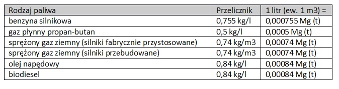 Ilość zużytego paliwa wskazuje się w megagramach [Mg], czyli w tonach. Jako że najczęściej dysponujemy danymi o zużyciu paliwa wyrażonymi w jednostkach objętości (litrach lub m3 w przypadku sprzężonego gazu ziemnego), to należy je przeliczyć na Mg według poniższych wzorów: