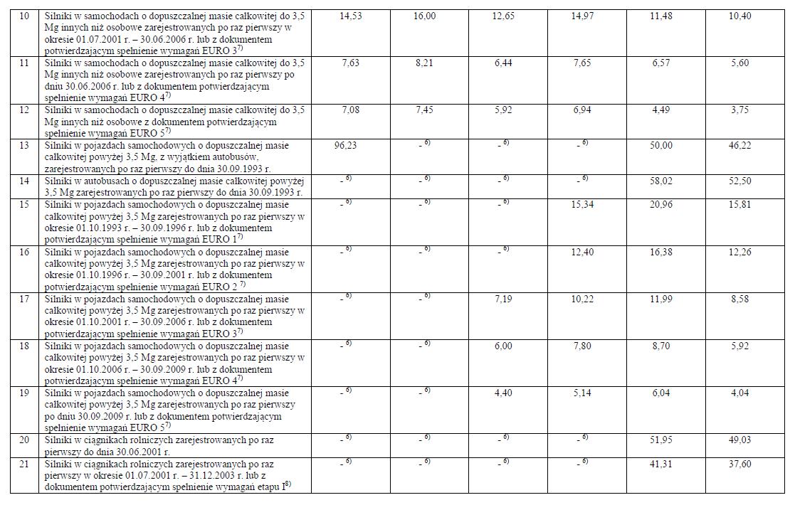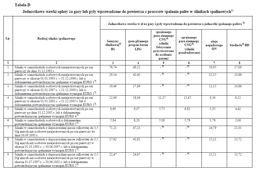 Poniżej przedstawiono pełną tabelę ze stawkami opłat dla tabeli D, przy czym dla samochodów osobowych stosowane będą zapisy pozycji 1-6 tabeli D, stosowane odpowiednio do spełnianych norm emisji spalin. Stawki dotyczą kolejno – benzyny silnikowej, gazu płynnego propanu-butanu, sprzężonego gazu ziemnego (silniki fabrycznie przystosowane), sprzężony gaz ziemny (silniki przebudowane), oleju napędowego i biodiesla.