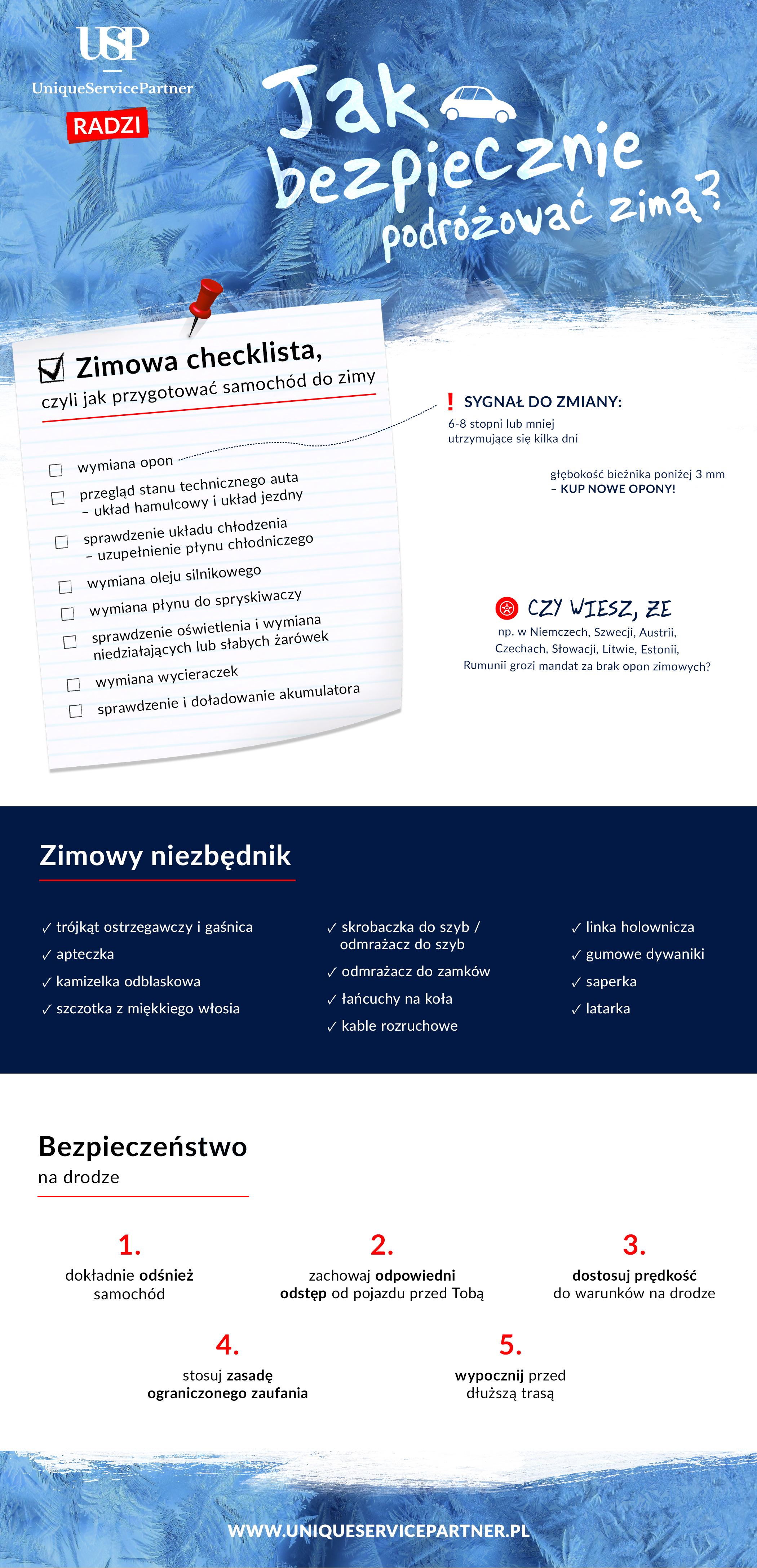 Niezależnie od pory roku, w samochodzie trzeba mieć trójkąt ostrzegawczy i gaśnicę, a warto też mieć apteczkę i kamizelkę odblaskową. Na zimowe podróże dodatkowo powinniśmy wyposażyć auto w szczotkę z miękkiego włosia, która pozwoli oczyścić szyby i dach ze śniegu. Kierowcy powinni pamiętać, że odśnieżenie tylko przedniej szyby nie wystarczy. Konieczne jest zapewnienie pełnego pola widzenia oraz pozbycie się śniegu z pojazdu, żeby w trakcie jazdy nie spadł wprost pod jadący za nami samochód. Konieczna będzie też skrobaczka, z którą pozbędziemy się oblodzenia, choć musimy być przy tym ostrożni, aby nie porysować szyby. Alternatywą jest odmrażacz do szyb. Można też pomyśleć o macie antyszronowej, dzięki której wyeliminujemy problem u źródła. Warto wyposażyć się też w odmrażacz do zamków, aczkolwiek ten należy mieć zawsze przy sobie, a nie w samochodzie, do którego możemy się nie dostać.